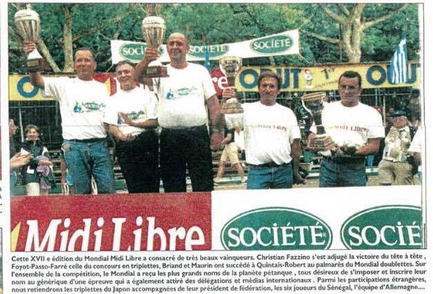 Vainqueur du Supra-National de Carmaux 2015 ![]() ![]() Vainqueur National Carmaux 2013 avec Autebon et Benoni. ![]() Vainqueur National Doublette 2004 avec Baldacchino contre Foyot ,Radnick 13/10. ![]() Vainqueur National triplette Blagnac. 1998 Baldacchino, torodemer. 1999 Zorzi , Pizzolato. 2002 Zorzi Parisé. ![]()